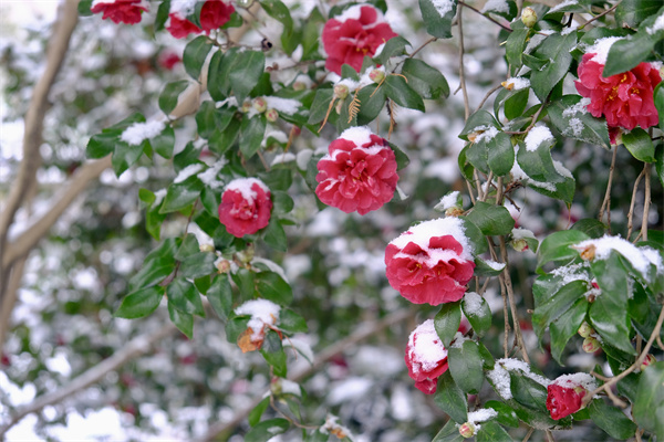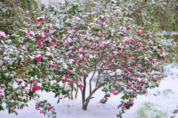 不畏嚴寒的茶梅,如風雪中的“俏佳人”,在雪中綻出“俏麗”春光。園內1000多株茶梅正值盛花期,它們以繁花滿枝的姿態,在素色天地里潑灑出大塊大塊的明媚色彩,為清冷的空氣注入一股鮮活的暖意。翠綠的枝葉托起松軟的白雪,粉紅、大紅色的花朵從白雪中熱烈地探出頭來,紅白相映,粉妝玉砌。近處花朵嬌艷欲滴,遠處花樹影影綽綽,在積雪覆頂的樹林襯托下,層次豐富,色彩對比鮮明,繪就一幅動人的“雪中點彩圖”。
