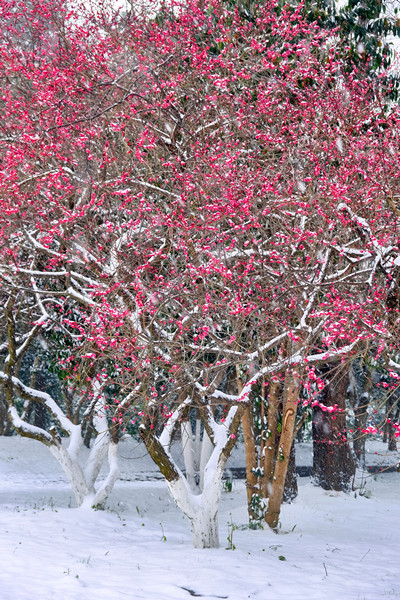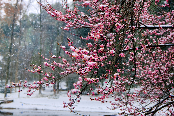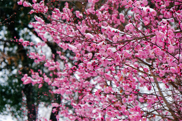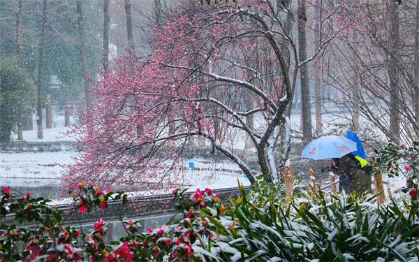 雪中賞梅,為一大雅事。在武漢植物園小梅園,怒放的朱砂梅、宮粉梅、江梅被白雪壓枝,更顯清絕風骨。虬勁的枝干上,積雪勾勒出遒勁的線條,而點點紅梅、粉梅綴滿枝頭,不與雪爭色,只以清雅示人。粉瓣凝晶,薄透如玉,與枝頭瑩雪相映成畫。虬枝橫斜,雪映嫣紅,疏影暗香自成一景。細雪紛飛中,游客或駐足細賞,或舉起手機記錄這難得一見的“雪壓梅枝”之美。