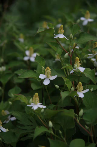魚腥草是三白草科蕺菜屬的多年生草本植物,它的葉子和花朵都頗有辨識度,葉子心型,背面常常為紫紅色。白色的“花瓣”清新而素雅,但這其實是它的苞片,其中豎立著長約2厘米的穗狀花序。