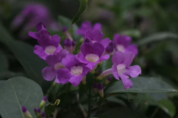 但其實,蒜香藤是一種美麗而浪漫的植物。開花的時候,深深淺淺的紫色花朵分布在蜿蜒的藤子上,在綠油油的葉子的襯托下,看起來高雅而別致,給人一種浪漫的感覺。它的花朵像一個個的小鈴鐺,因此也叫“紫鈴藤”。