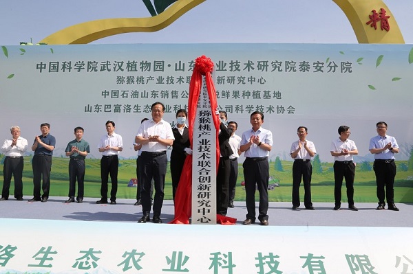 5月31日,“中國科學院武漢植物園-山東產業技術研究院泰安分院·獼猴桃產業技術聯合創新研究中心”揭牌儀式在道朗鎮巴富洛生態農業科技有限公司基地舉行。武漢植物園主任王青鋒、副主任黃偉、科研處處長陳良、凈果獼猴桃遺傳育種學科組負責人王彥昌等應邀參加。