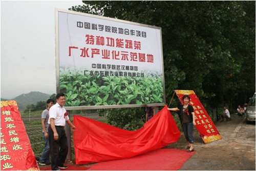 7月6日,由中國科學院武漢植物園和廣水市東晨農業技術有限公司共同合作的“特種功能蔬菜廣水產業化示范基地”正式落戶湖北省廣水市,這標志著特種功能性蔬菜的開發邁入了產業化的新階段。中國科學院武漢植物園黨委副書記龔俊杰,廣水市委常委、紀委書記、市農村工作領導小組組長儲云出席儀式,并為示范基地揭牌。