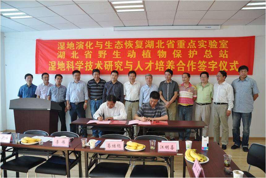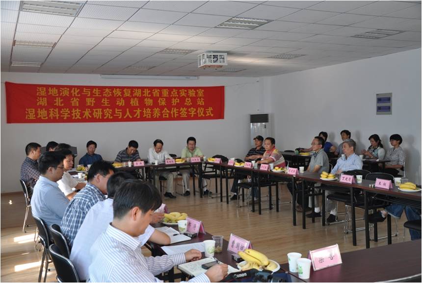 隨后舉行了簽字儀式,濕地演化與生態恢復湖北省重點實驗室主任李偉研究員和湖北省野生動植物保護總站站長侯開舉教授級高級工程師代表雙方在合作協議上簽字。并就今后的具體合作進行了深入地探討。
