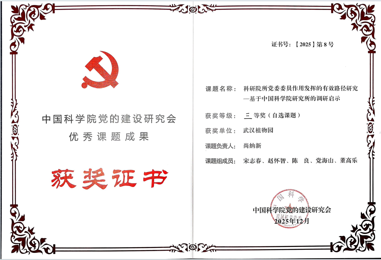 此次獲獎是院黨建研究會對武漢植物園黨建研究工作的肯定,武漢植物園將以此次課題成果為基礎,進一步推動黨建與科研工作深度融合,持續提升基層黨建工作的針對性與實效性。
